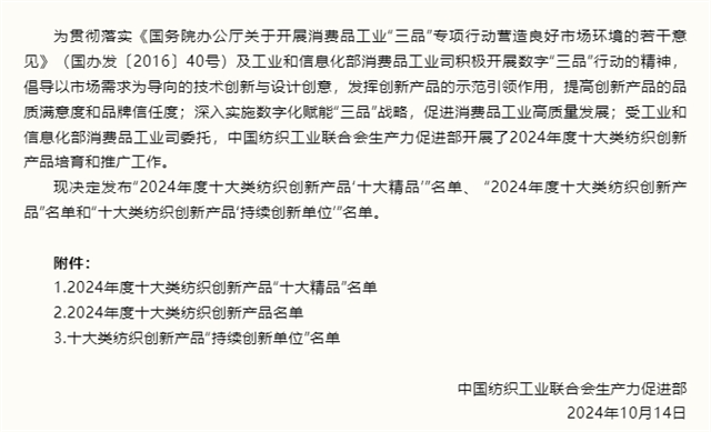 導讀:近日,中國紡織工業聯合會生產力促進部發布了“2024年度十大類紡織創新產品‘十大精品’”名單、“2024年度十大類紡織創新產品”名單和“十大類紡織創新產品‘持續創新單位’”名